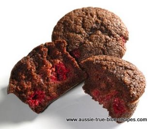 Add the raspberries and choc bits, stirring so they are evenly disbursed. Pour into greased muffin tins.