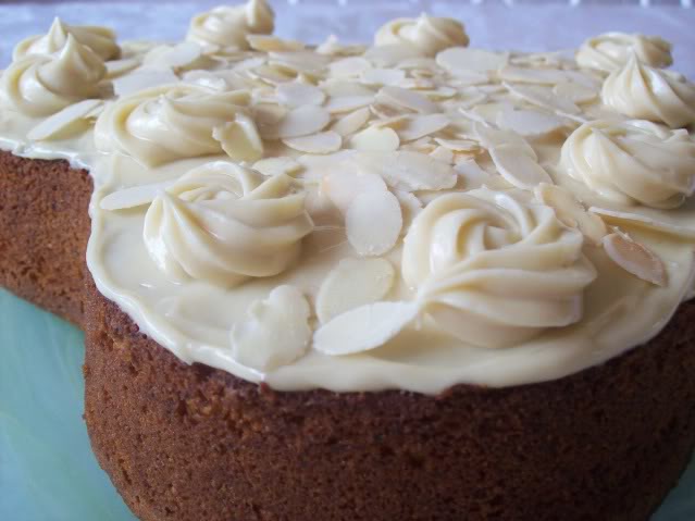 Spread top of cooked cake with Cream Cheese Frosting; sprinkle with toasted slivered almonds.